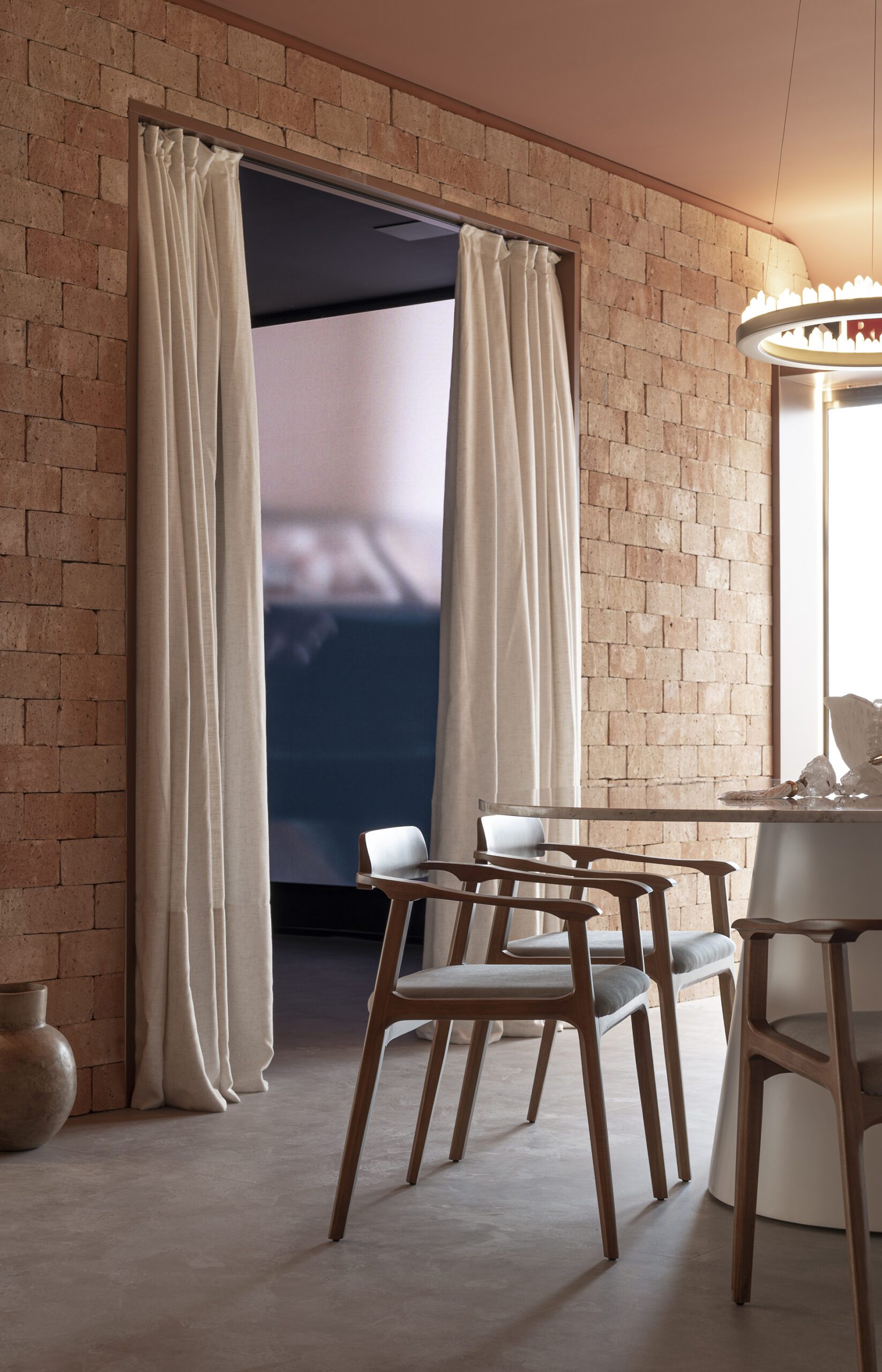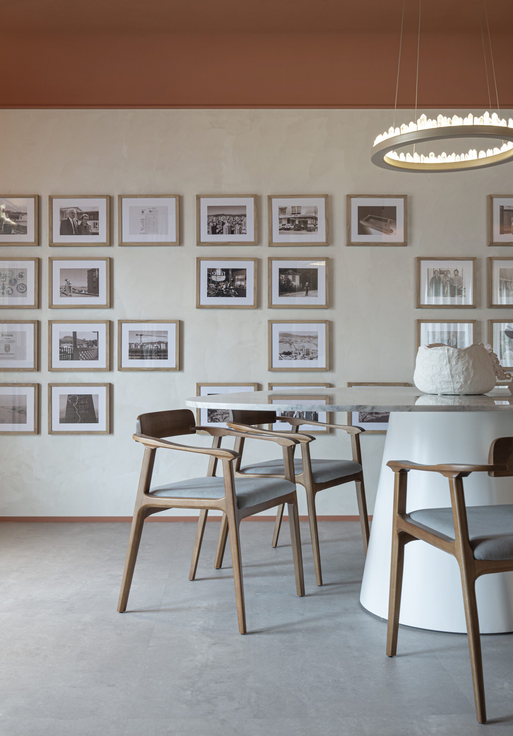 Totalmente em sintonia com as principais tendências do mercado, o projeto contempla linhas curvas (orgânicas), tanto nos móveis soltos como nas paredes e objetos de design assinado. A cor terracota, remetendo aos tijolos desses 41 anos da RDO e as escolhas dos objetos de estima deixam o ambiente comercial com a atmosfera acolhedora de uma residência. O tampo da mesa, com design orgânico em pedra natural é outro destaque. Um pendente cravejado de cristais conversa com um objeto decorativo à mesa, com a mesma pedra.