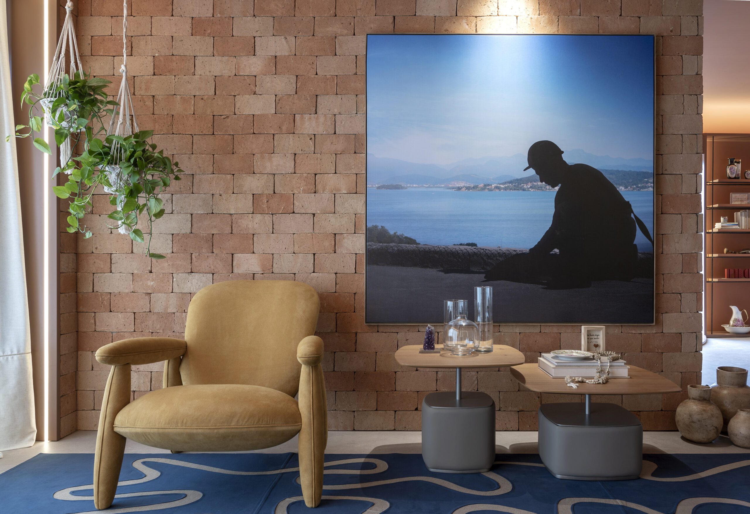 As profissionais destacam o tapete do estar, em azul, com linhas brancas arredondadas, simbolizando a longa travessia dos antepassados pelo oceano, as ondas dos mares e os desafios de unir expectativas e construir o futuro das próximas gerações. A peça tem desenho exclusivo do escritório e foi feita por um artesão. O legado da família, presente em todo o ambiente, está em pura sintonia com o tema da mostra deste ano: De presente, o agora. E responde à pergunta: que tipo de ancestrais queremos ser?
